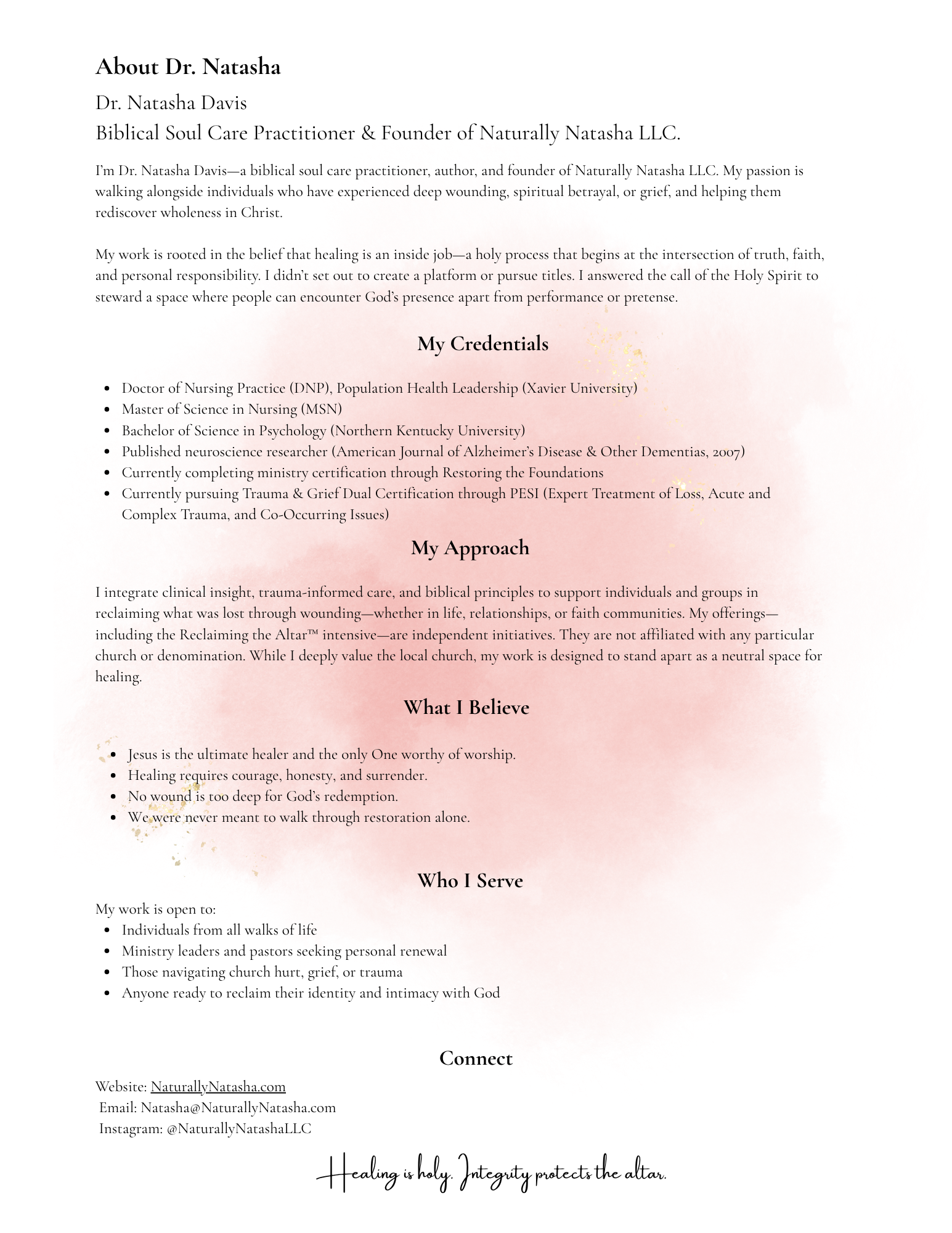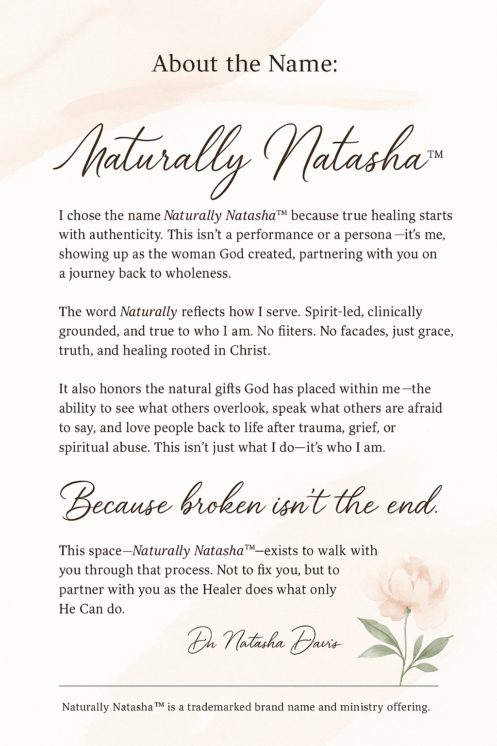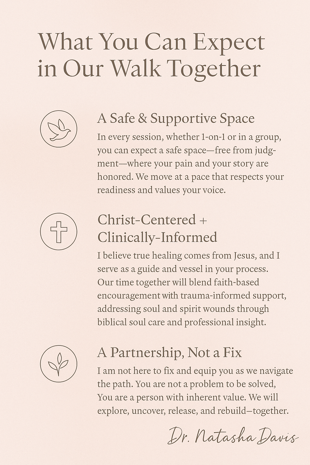 Welcome! I’m Dr. Natasha Davis, and I provide Christian-based support to help women and men experience healing from emotional, relational, and spiritual wounds. I walk alongside those navigating family trauma, grief, church hurt, and identity restoration—always pointing back to the true Healer, Jesus Christ.