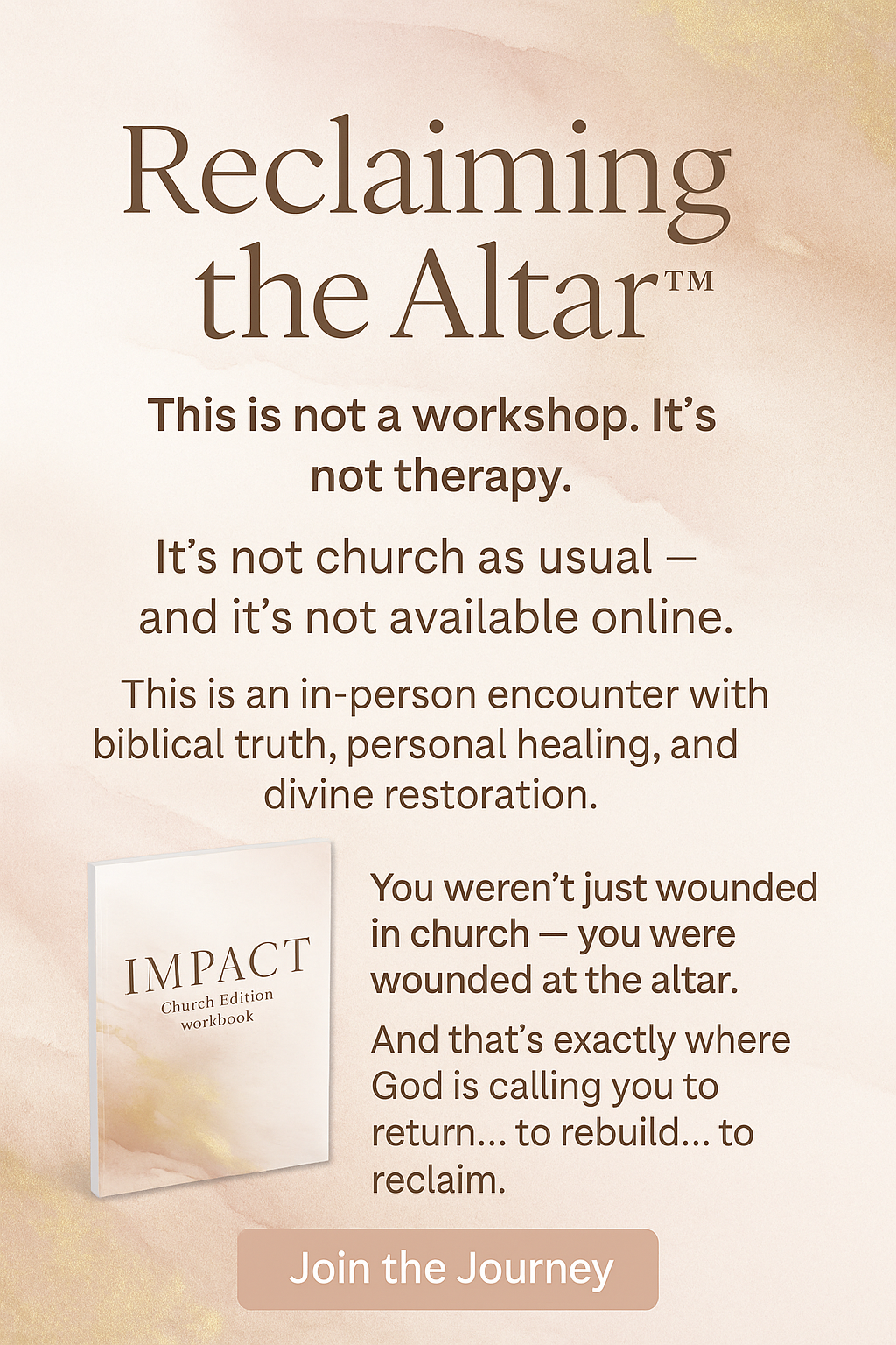 Reclaiming the Altar™ is a Christ-centered, trauma-informed, in-person experience designed to bring healing to those wounded in religious spaces.